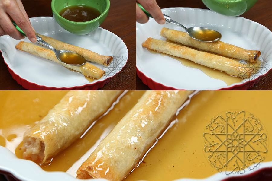 في طبق، يخلط اللوز مع السكر الخشن والمستكة (المسكة الحرة). يمرر الخليط في المفرمة للحصول على عجين لوز لين. يمزج عجين اللوز مع الزبدة، ماء الزهر والقرفة. تحضر عصي طويلة من عجين اللوز. تصفف أنصاف أوراق البسطيلة بشكل طولي وتلصق بأبيض البيض للحصول على شريط طويل من أوراق البسطيلة. توضع عصا من عجين اللوز فوق شريط أوراق البسطيلة. يلف شريط أوراق البسطيلة حول عجين اللوز وتلصق الجوانب بأبيض البيض. تدهن العصي بالزيت أو الزبدة المذابة. تطهى في الفرن المسخن على درجة الحرارة 180 لمدة 15 دقيقة تقريبا. يخلط العسل مع ماء الزهر وتسقى به العصي عند إخراجها من الفرن. تترك عصي الحلوى تتشرب العسل لمدة ساعتين. تقطع عصي الحلوى إلى قطع بطول 3 سم. تزين قطع "محنشة" برقائق اللوز المحمصة.