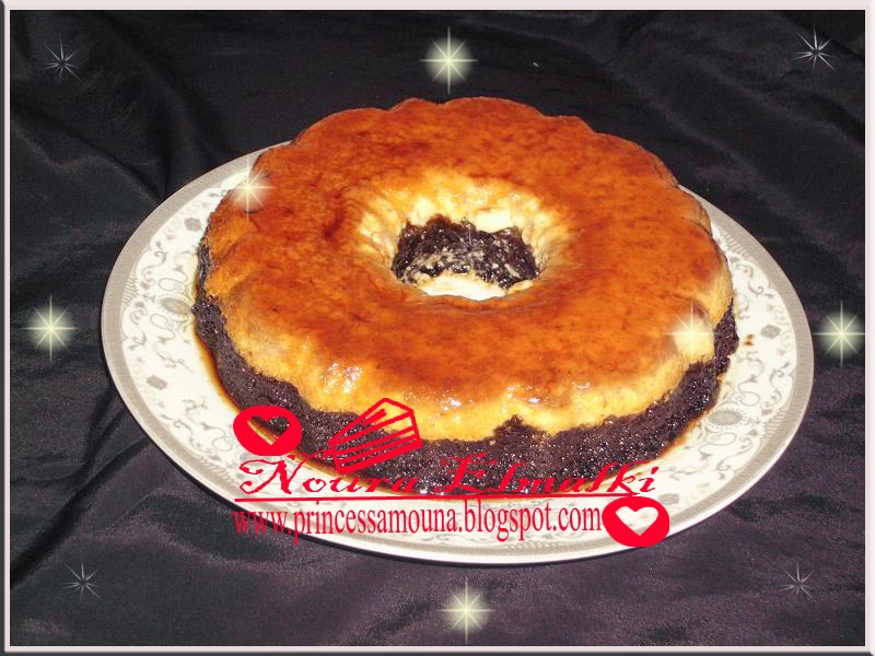 يفرغ خليط الكيك فوق الكريم ثم يفرغ الماء الغليان في صحن الكيك ويدخل الفرن المسخن من قبل يترك الكل حتى ينضج مابين 30 و 35 دقيقة يكون جاهز